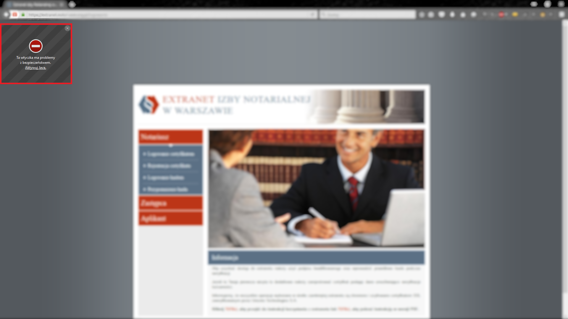 Domyślnie przeglądarki blokują możliwość wykorzystania apletu JAVA. W obrębie domeny https://extranet.notariusze.org.pl należy zezwalać na wszystkie komunikaty wyświetlane na ekranie. Docelowo w okolicach adresu URL nie powinno być żadnej ikonki ostrzegawczej (kolor czerwony)