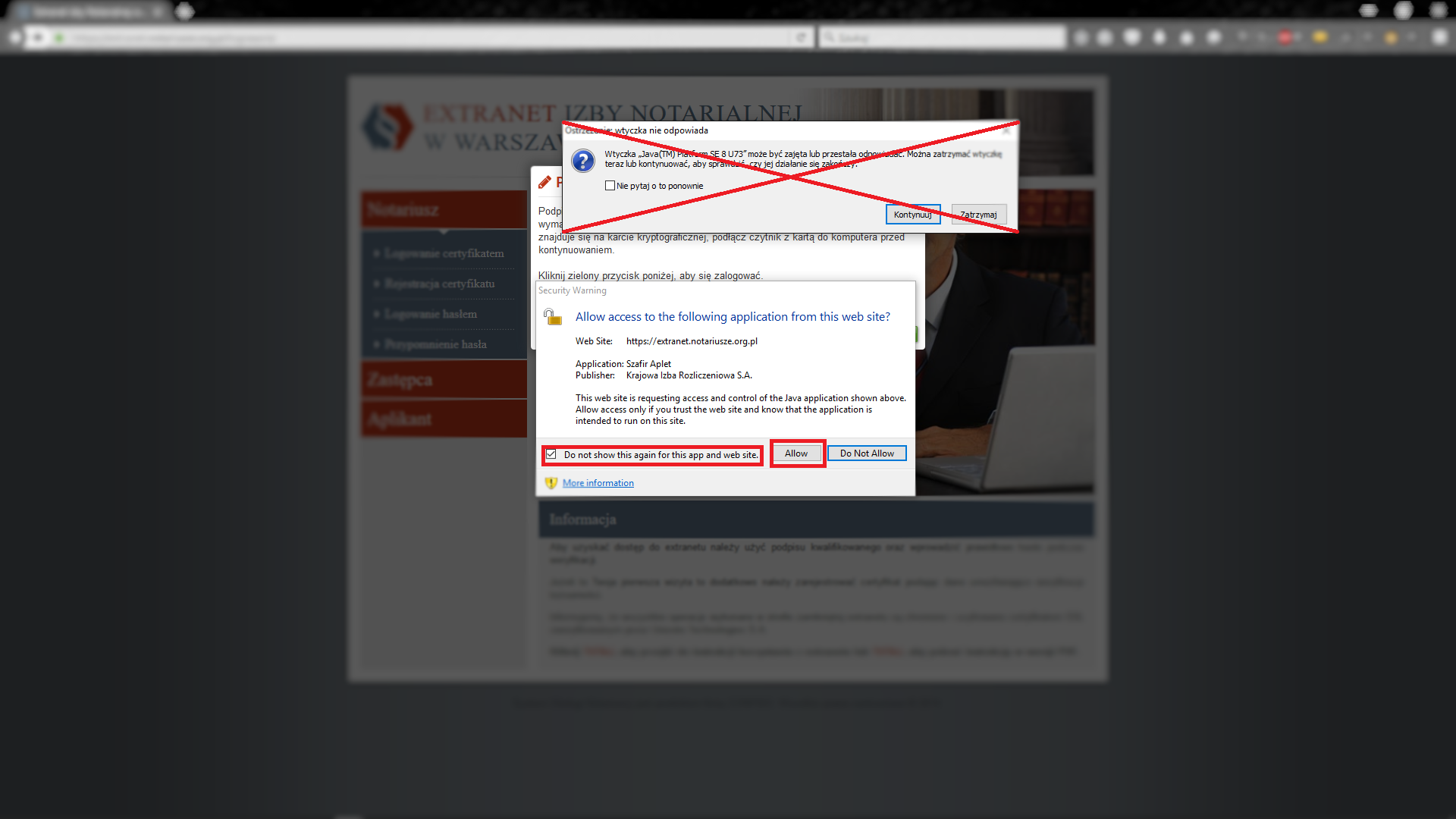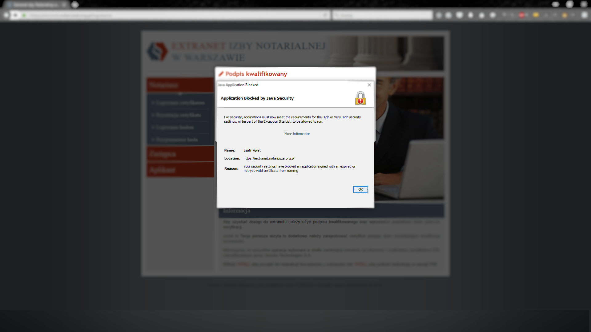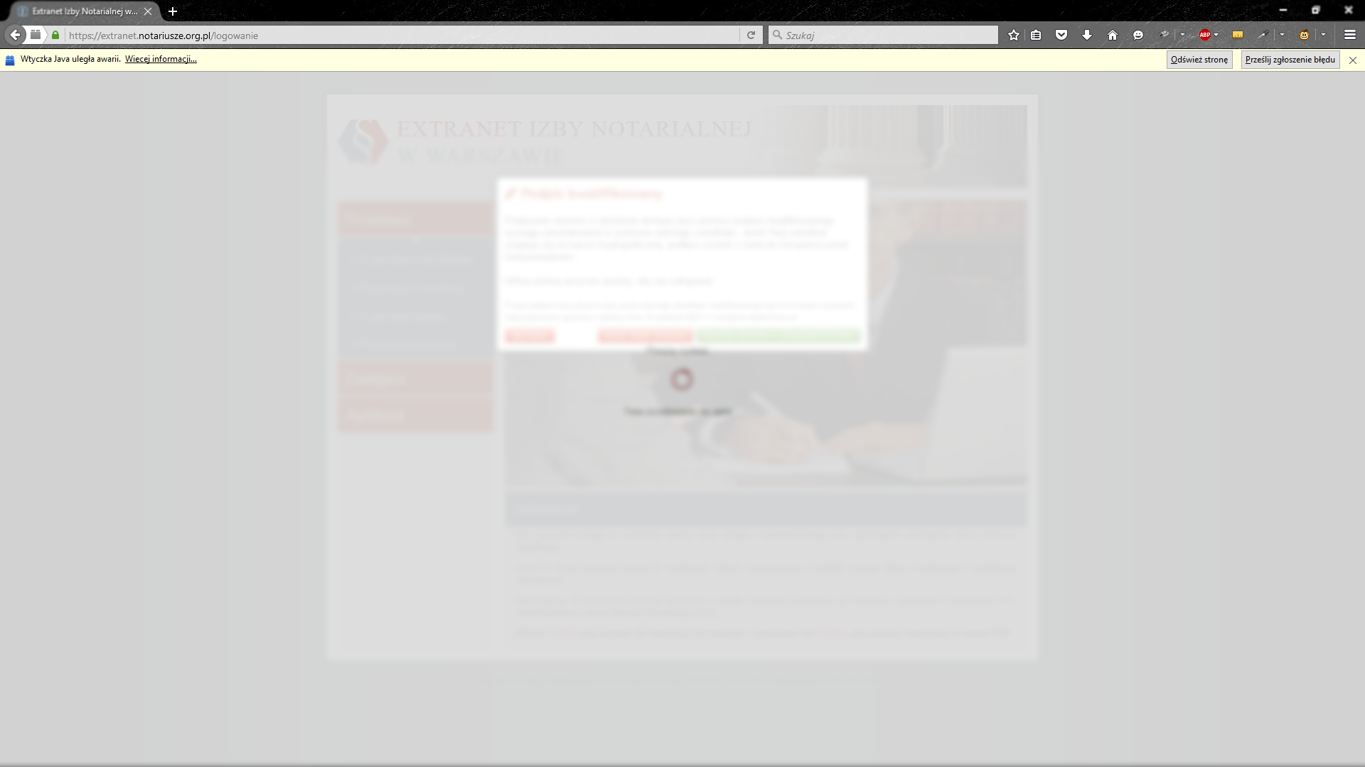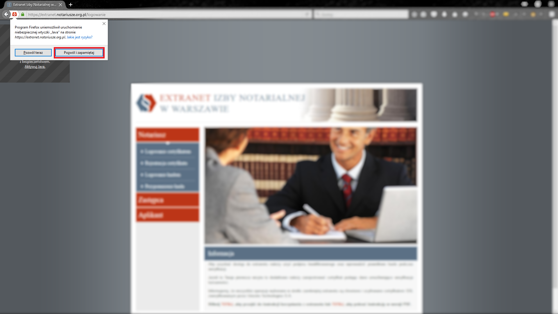 5.4 Domyślnie zablokowany aplet JAVA dla domeny https://extranet.notariusze.org.pl/ (Mozilla Firefox / Internet Explorer)