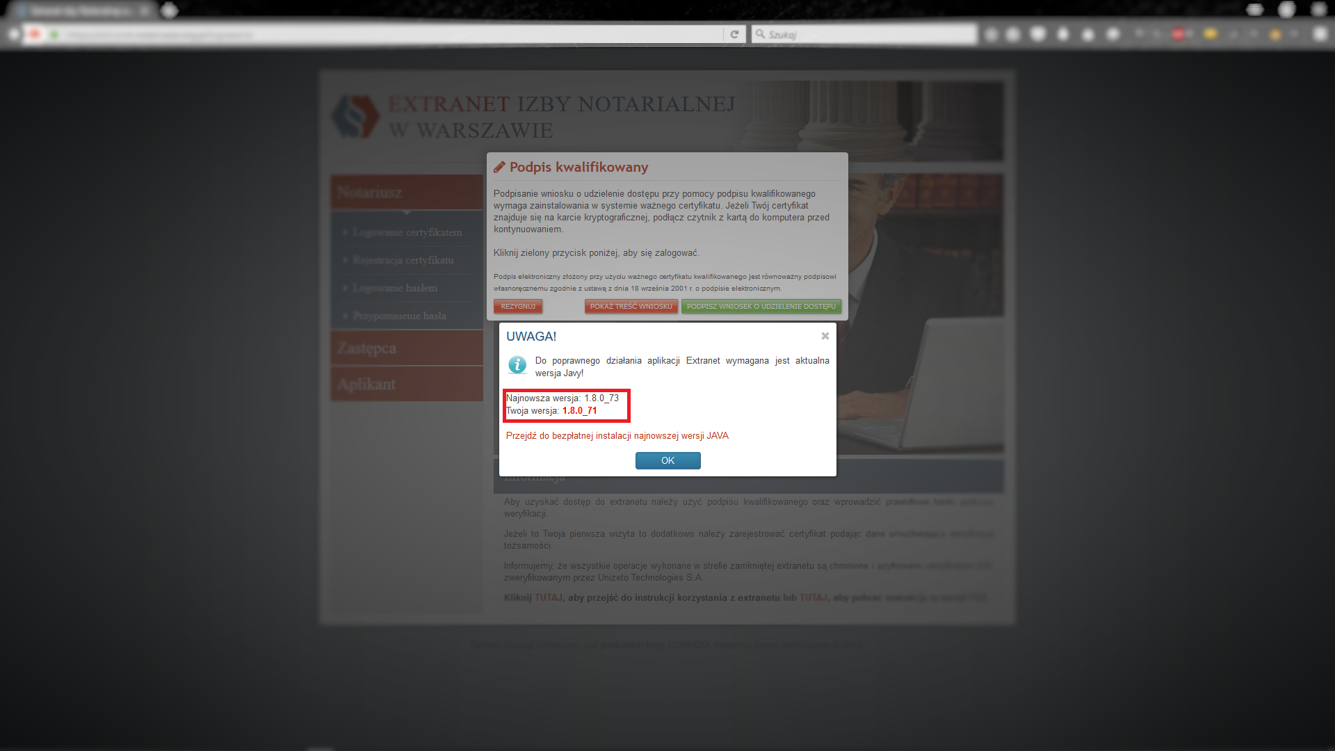 Poniższe zdjęcia zaprezentują rozwiązania problemów związanych z wykorzystaniem podpisu kwalifikowanego do logowania w extranecie. Ze względu na różnorodność przeglądarek niektóre z plansz mogą ukazywać elementy delikatnie różniące się od tych na Państwa komputerze. Należy również pamiętać, aby utrzymywać przeglądarkę jak również inne komponenty aktualne. Nieaktualna przeglądarka i/lub komponenty mogą powodować utrudnienia lub uniemożliwią korzystanie z extranetu.