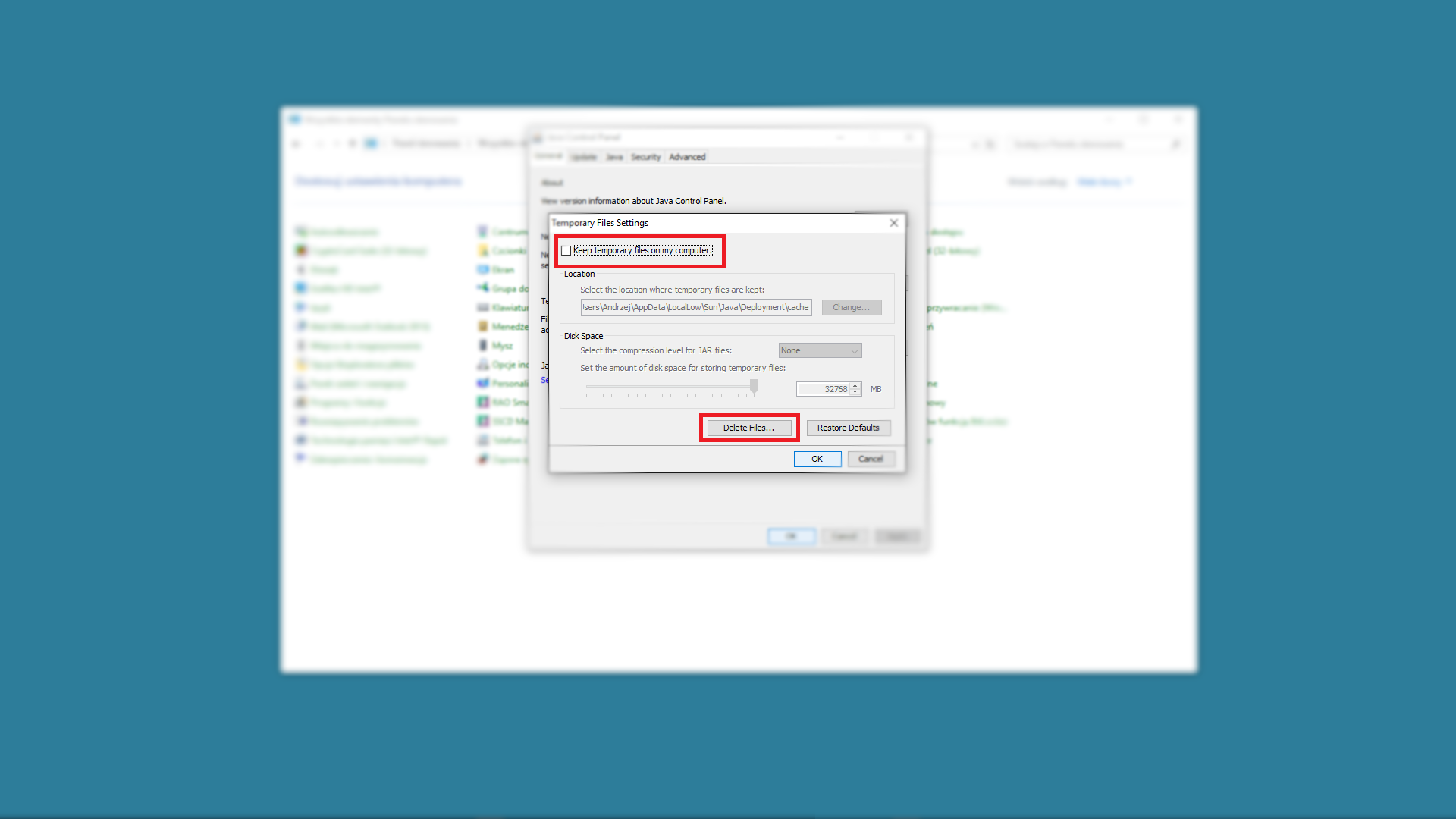 Odznaczamy opcję "Keep temporary files on my computer." a następnie klikamy "Delete Files..."