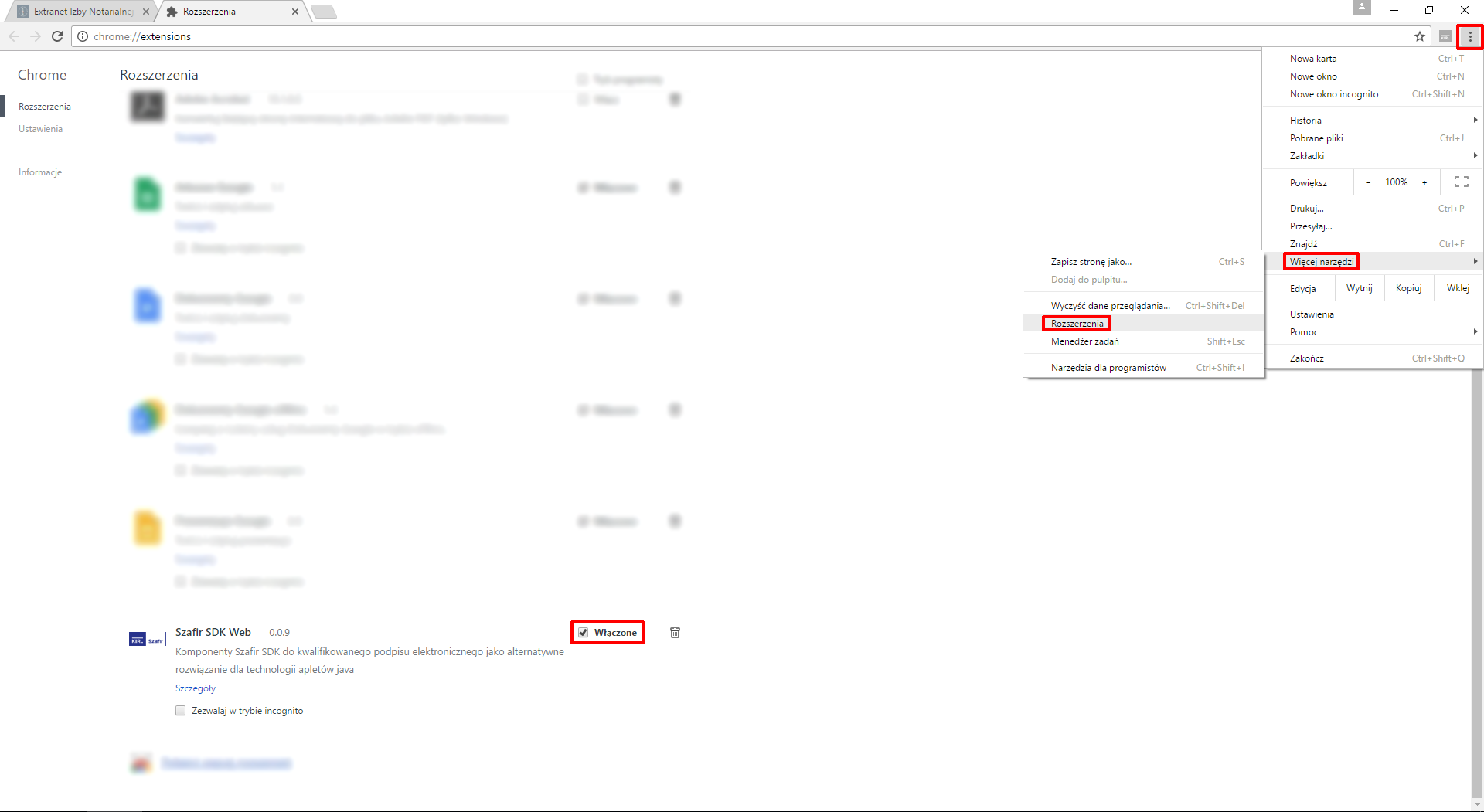 Jeżeli mimo zainstalowanego rozszerzenia wyświetla się komunikat o jego braku należy sprawdzić, czy rozszerzenie jest włączone.