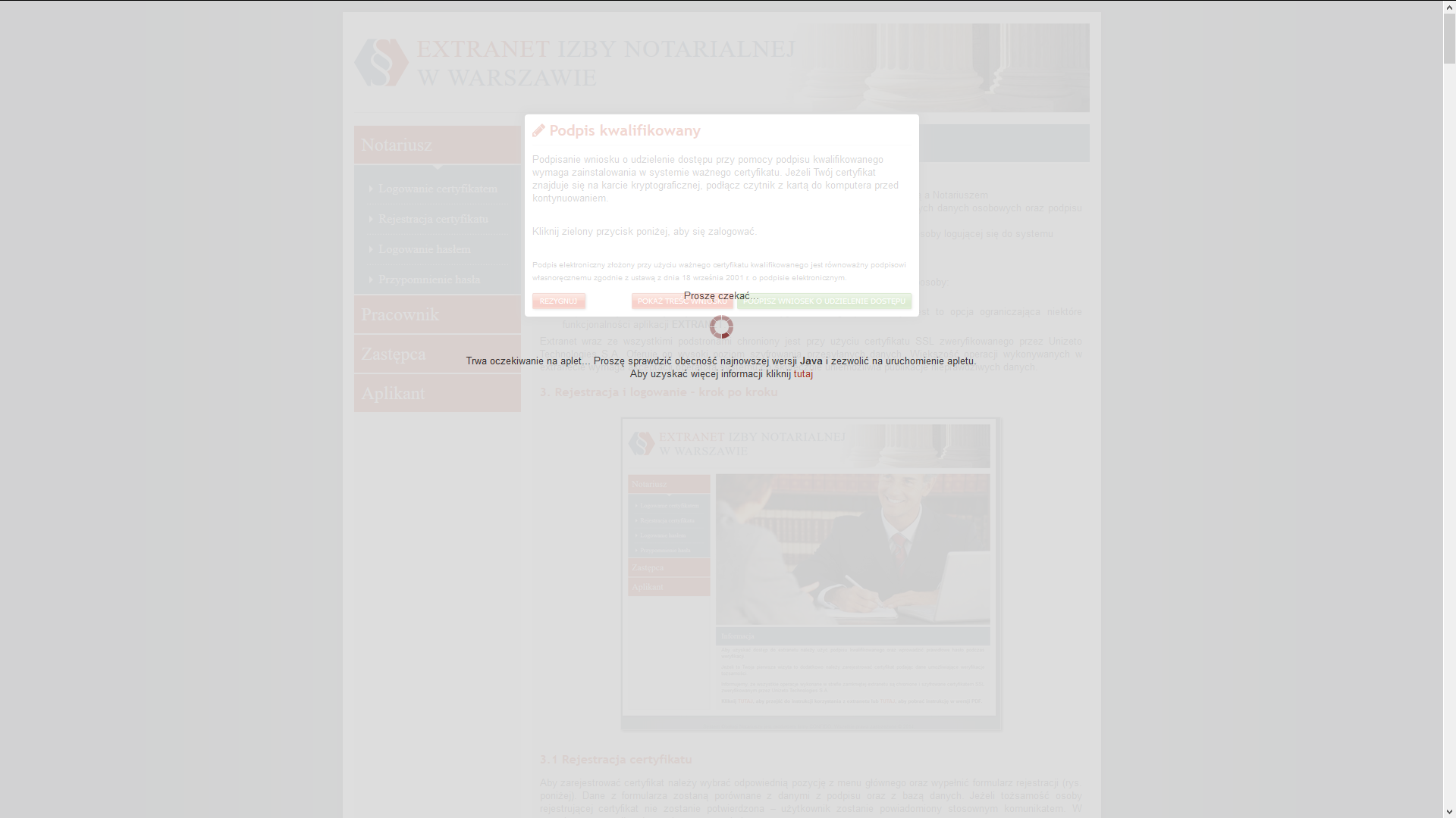 Po aktualizacji JAVA do wersji 8u73 należy zezwolić domenie extranetu na korzystanie z apletu.