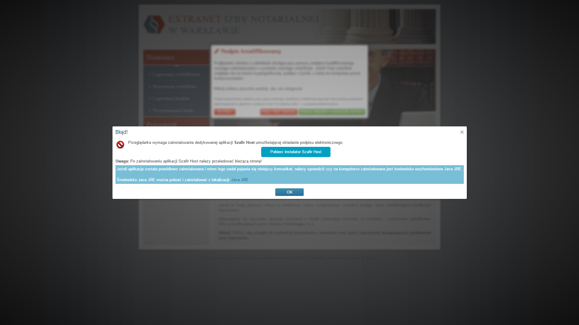 W przypadku komunikatu o braku zainstalowania dedykowanej aplikacji Szafir Host, należy je zainstalować klikając na przycisk "Pobierz instalator Szafir Host".