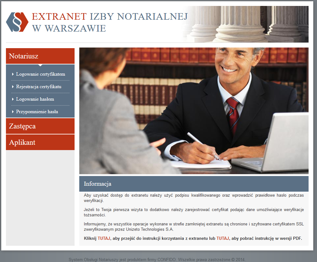 - Extranet – wydzielona przestrzeń do wymiany poufnych informacji pomiędzy Izbą a Notariuszem